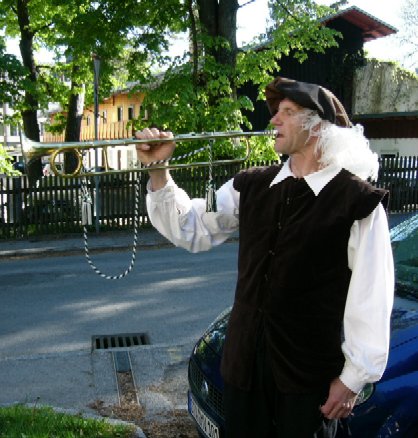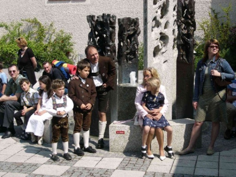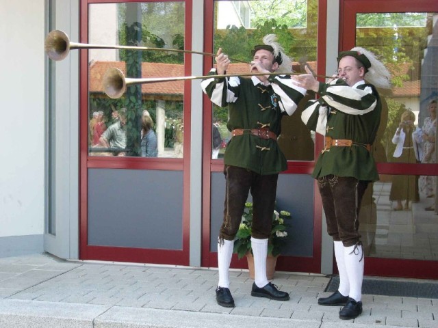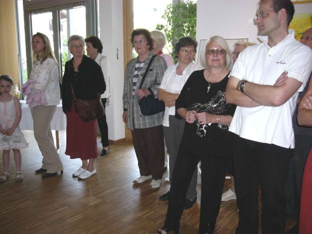 Zur Vernissage vom 29.04.2007 um 11.30 Uhr Im Innenhof des Roncalli Hauses wurde die Vernissage bei strahlendem Sonnenschein durch zwei historische Trompeten (Busine) von Herrn Pfeifer und Herrn Klinglmair Herr Pfarrer Brummer begeisterte die Gäste mit seiner schwungvollen Rede sofort und Die fröhlichen, lebensbejahenden Farben der Bilder übertrugen sich unmittelbar auf die begeisterten Gäste der Vernissage und verbreitete eine harmonische, fröhliche Atmosphäre. |